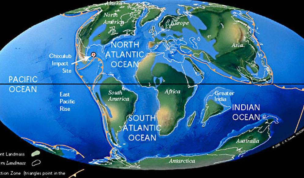 ちなみに、下の地図にも書かれてますが、メキシコ湾に落下して大破局をもたらした隕石は約6600万年前です。