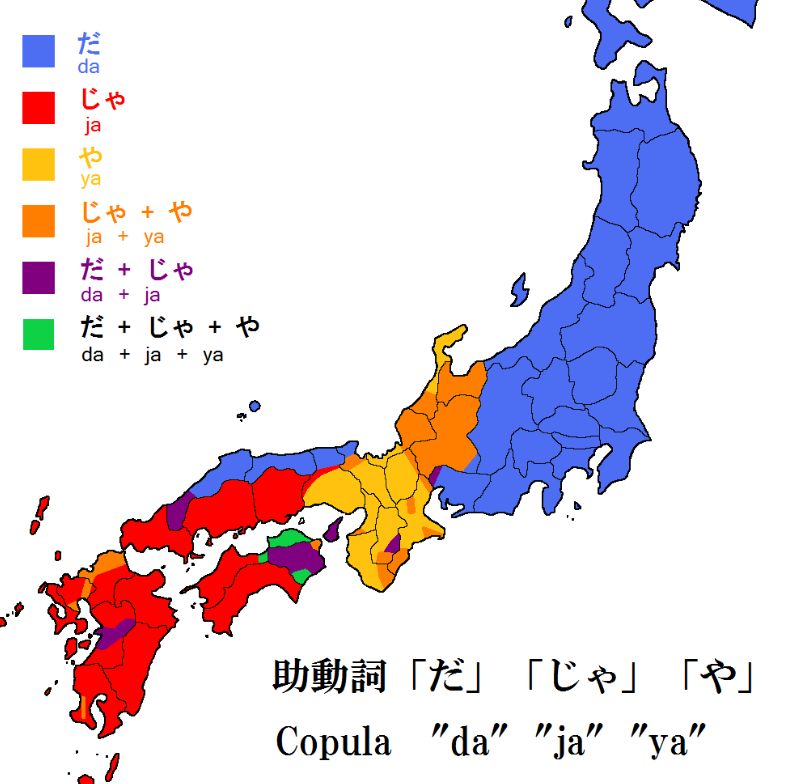 以下、wikiより、語尾に「だ」「じゃ」「や」の何を付けて話すか?の分布です。