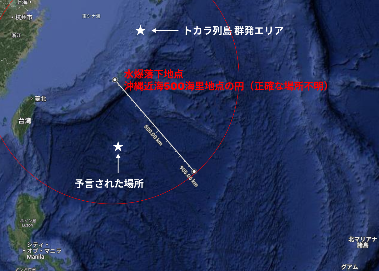 実際に地図上で、沖縄を中心に半径900kmの円を描いてみたところ、たつき氏の予言で指摘された地点とも重なる範囲に入っていました。