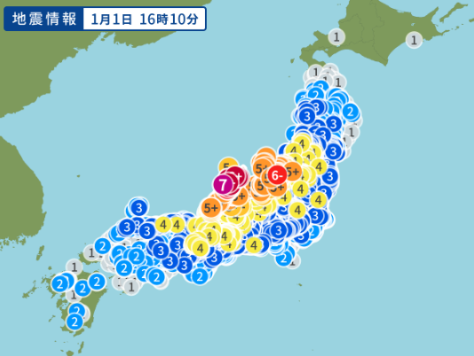 ちなみに、今回の能登半島地震については、同研究所のWEBサイトの中に日本全体の強震モニタの図はありませんでした。